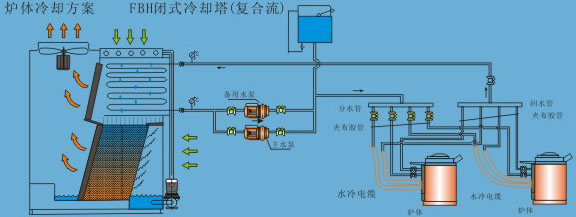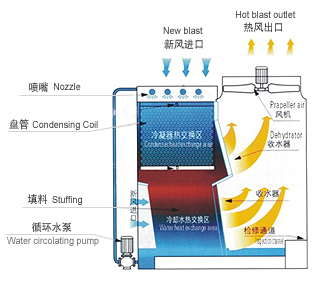 閉式冷卻塔將冷卻塔和熱交換的功能合在一起,將工藝流體的溫度降低到相當(dāng)接近空氣濕球溫度的情況下。系統(tǒng)工作時(shí),需要冷卻的工藝流體在蛇形的熱交換器盤管內(nèi)部流動(dòng),外部有噴淋系統(tǒng)以持續(xù)濕潤(rùn)盤管表面。噴淋到盤管上的水流經(jīng)一段具有高效冷卻作用的PVC熱交換層進(jìn)行冷卻后再落至集水盤中以再循環(huán)利用??諝馔瑫r(shí)吸入并通過(guò)盤管和PVC熱交換層,使得一部分水蒸發(fā)。氣流中所夾帶的所有水分均由飛濺水擋水板進(jìn)行回收,并送回至集水盤。藉由蒸發(fā),將熱量從噴淋水中帶走,進(jìn)而冷卻盤管及盤管中工藝流體。