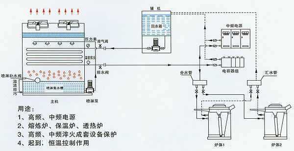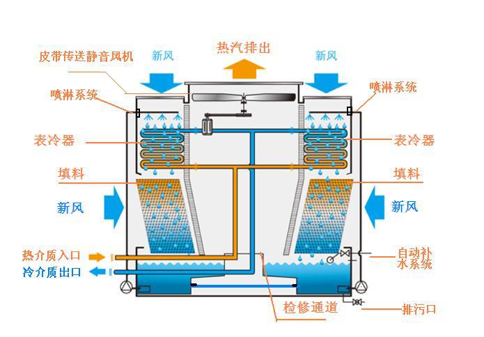 工作流體(水或其他液體)在冷卻對(duì)象及盤(pán)管內(nèi)循環(huán)流動(dòng),其熱量通過(guò)盤(pán)管壁以顯熱換熱的方式傳遞給流經(jīng)盤(pán)管外表面的噴淋水。噴淋水吸收熱量后,以自身重力掉落會(huì)塔體集水盤(pán),通過(guò)噴淋泵,經(jīng)布水系統(tǒng)送到噴嘴。溫?zé)岬膰娏芩谔盍媳砻嫘纬梢粚雍鼙〉谋∧?,以達(dá)到*佳的冷卻效果。同時(shí)通風(fēng)機(jī)系統(tǒng)啟動(dòng),使機(jī)組外大量的空氣以與噴淋水垂直的方向從進(jìn)風(fēng)格柵進(jìn)入。空氣和水在填料表面直接接觸,一小部分水蒸發(fā)。在這個(gè)蒸發(fā)過(guò)程中,噴淋水將熱量以潛熱換熱的方式傳遞給流過(guò)機(jī)組的空氣。飽和氣流從閉式冷卻塔頂部的通風(fēng)機(jī)排放到周?chē)髿庵?,從而將熱量消散。其余被填料部分冷卻的噴淋水淋向盤(pán)管,落入水盤(pán),這就是橫流式閉式冷卻塔的工作原理。