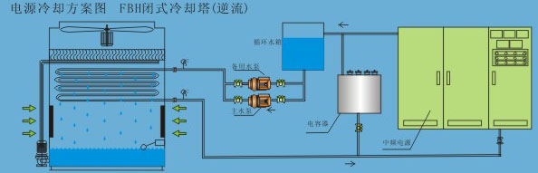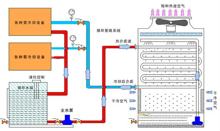 閉式冷卻塔利用蒸發(fā)型冷卻的高效率有效地冷卻冷媒,并保護冷媒免受可能的污染。冷水噴淋在盤管外表面時,熱的冷媒流經銅盤管內部。向上鼓風使新鮮空氣流經銅盤管外表面,同時冷水以高效的逆流方式噴淋在盤管上。冷媒的熱量傳導給噴淋的水,降低了它的溫度。噴淋水吸收的熱量通過蒸發(fā)釋放到大氣中。