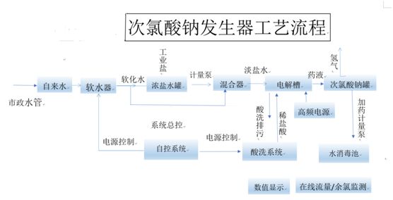 次氯酸鈉是強氧化劑和消毒劑,它是通過取源于廣泛價廉的工業(yè)鹽或海水稀溶液,經(jīng)無隔膜電解而發(fā)生的。為確保次氯酸鈉質(zhì)地新鮮和有較高的活性。保證消毒效果,本裝置一邊發(fā)生,一邊將發(fā)生的次氯酸鈉投加使用。它與氯和氯的化合物相比,具有相同的氧化性和消毒作用。