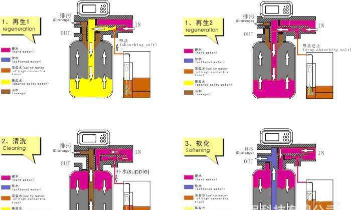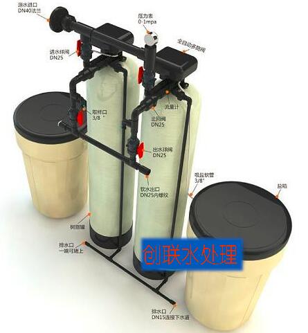 單閥雙罐系統(tǒng)即兩個(gè)樹脂罐一個(gè)多路閥、一個(gè)鹽箱,一個(gè)樹脂罐系再生時(shí),另一個(gè)工作,實(shí)現(xiàn)24小時(shí)不間斷連續(xù)運(yùn)行